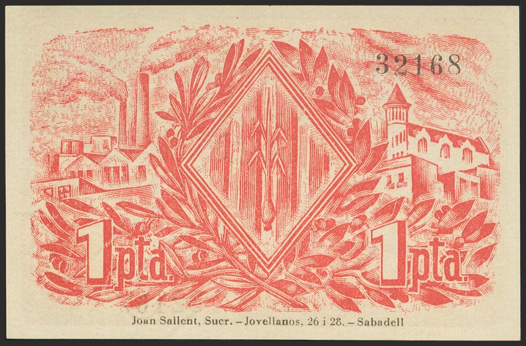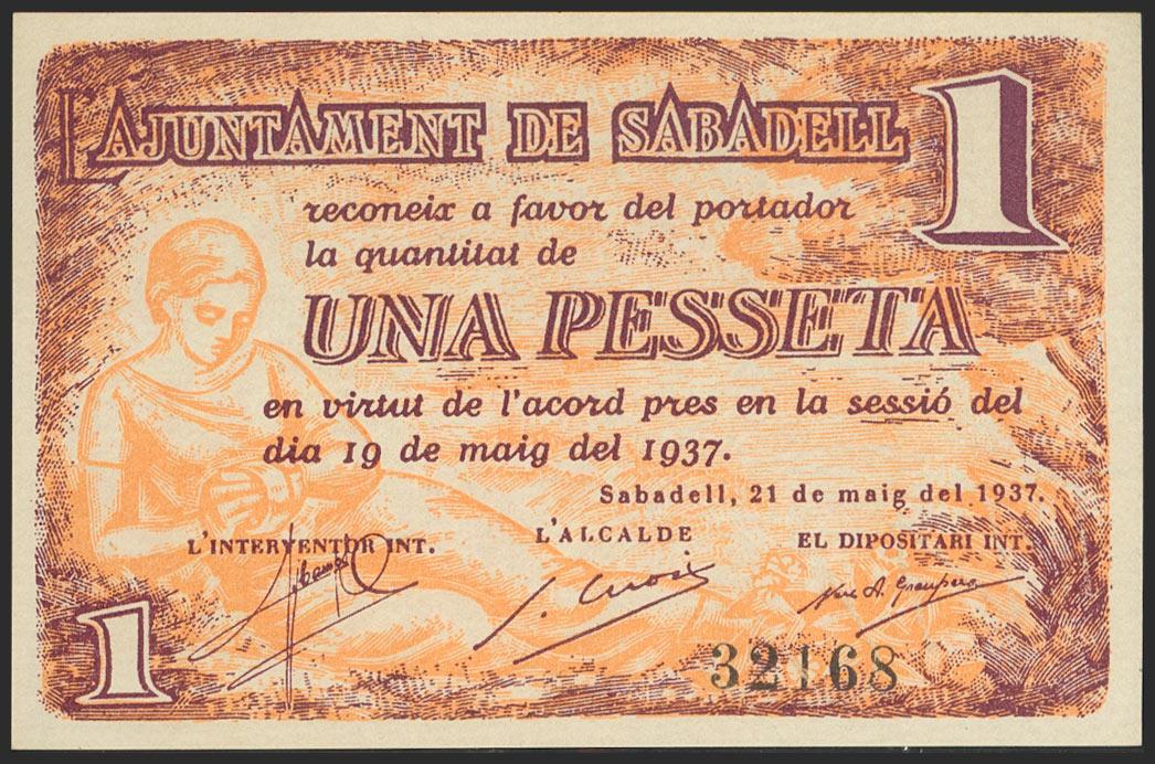 SABADELL (BARCELONA). 1 peseta. May 19, 1937. (González: 9777). Uncirculated.
