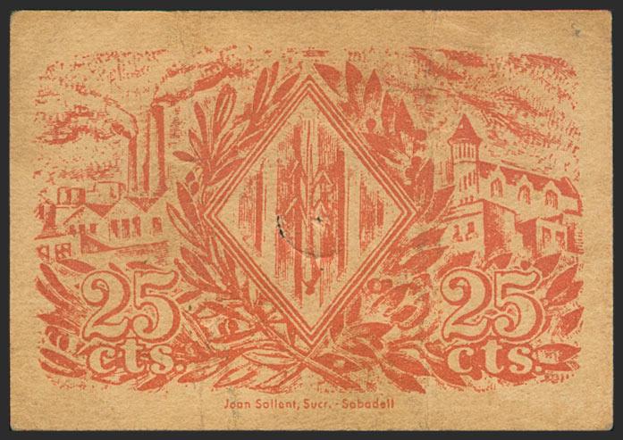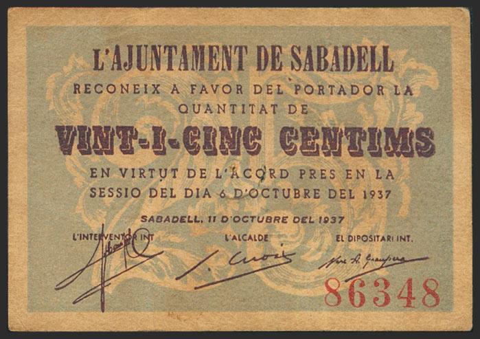 SABADELL (BARCELONA). 25 cents. October 11, 1937. (González: 9778). Extremely Fine.