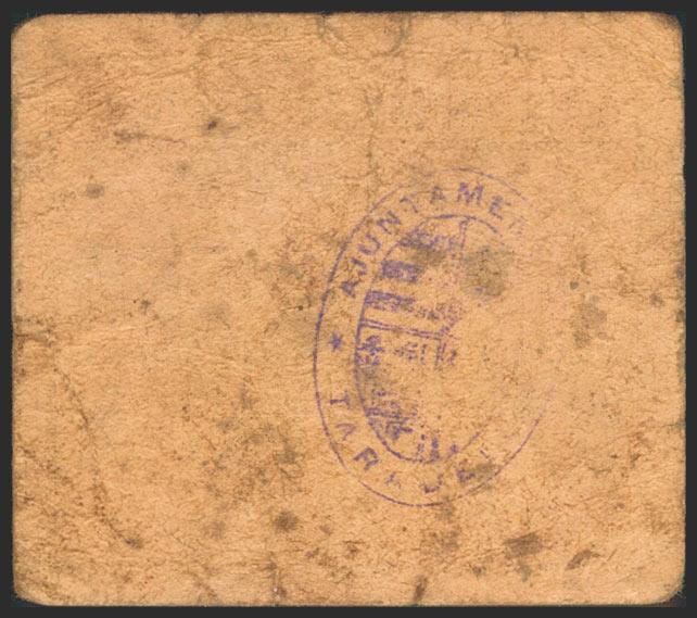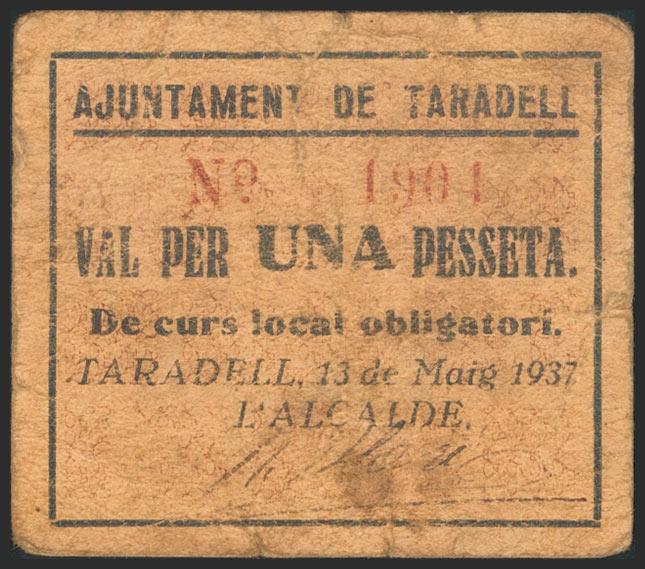 TARADELL (BARCELONA). 1 peseta. May 13, 1937. (González: 10081). Very rare. Fine.