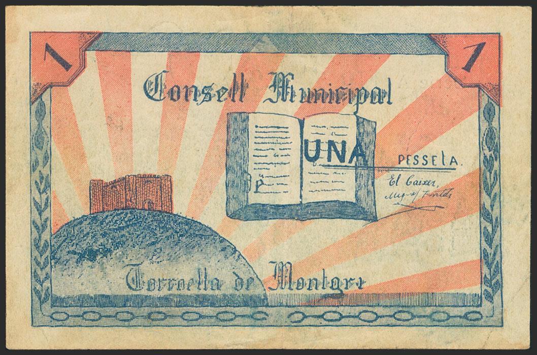 TORROELLA DE MONTGRI (TARRAGONA). 1 peseta. Series A. (González: 10391). Rare Very Fine.