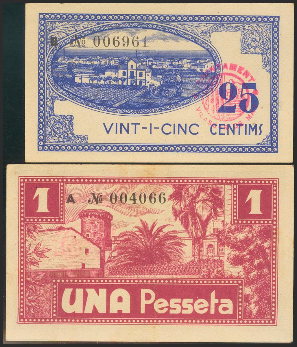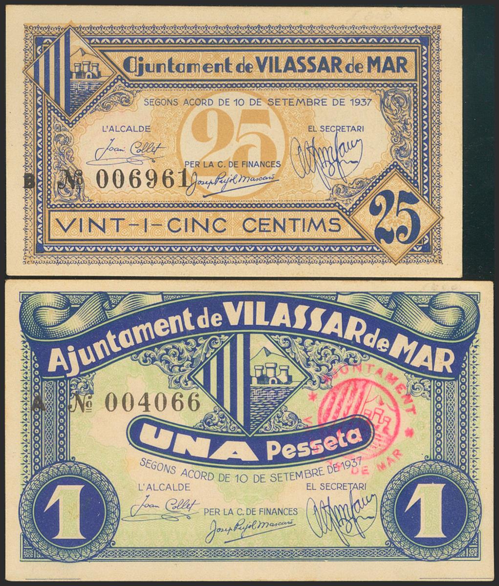 VILASSAR DE MAR (BARCELONA). 25 Cents and 1 Peseta. October 10, 1937. Series A and B, respectively. (González: 10868/69). Complete series. Extremely Fine/ Good Extremely Fine.
