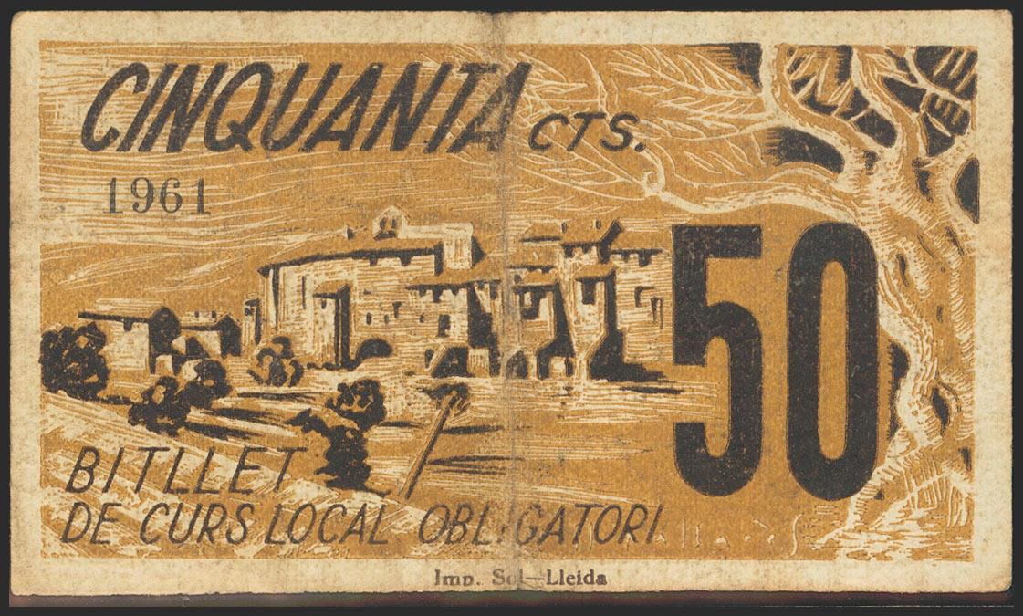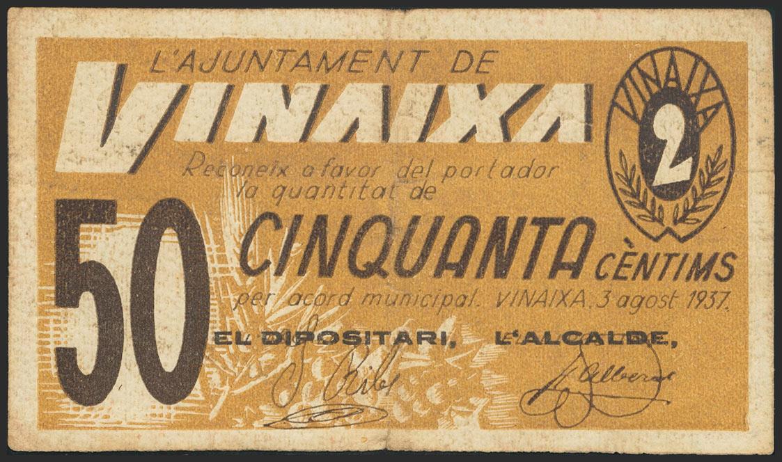 VINAIXA (LERIDA). 50 cents. August 3, 1937. (González: 10912). Very rare. Very Fine.