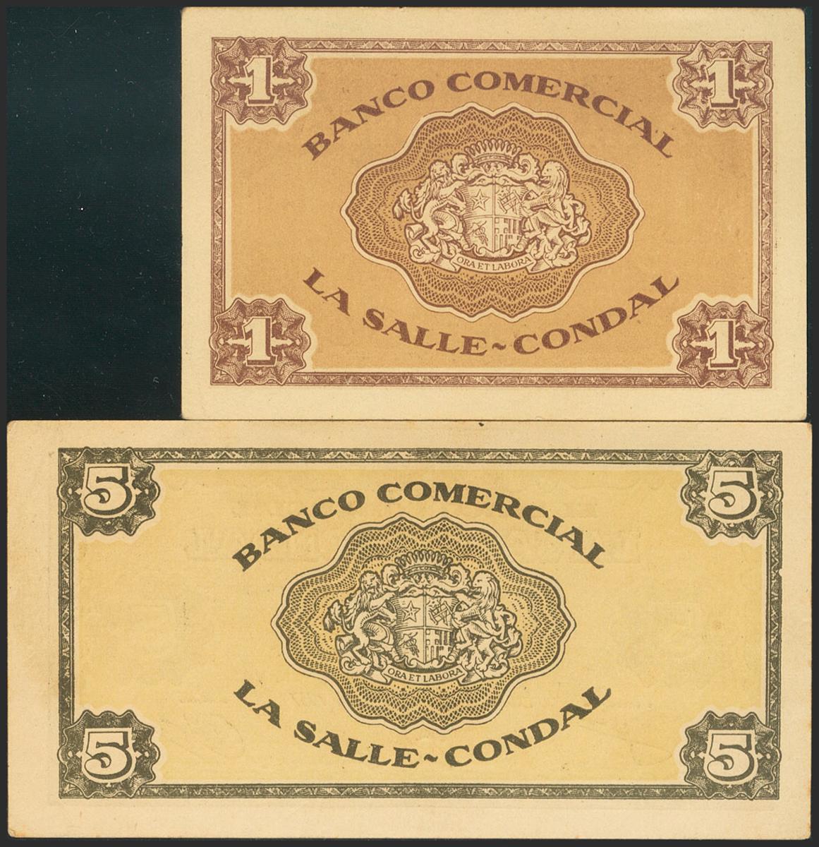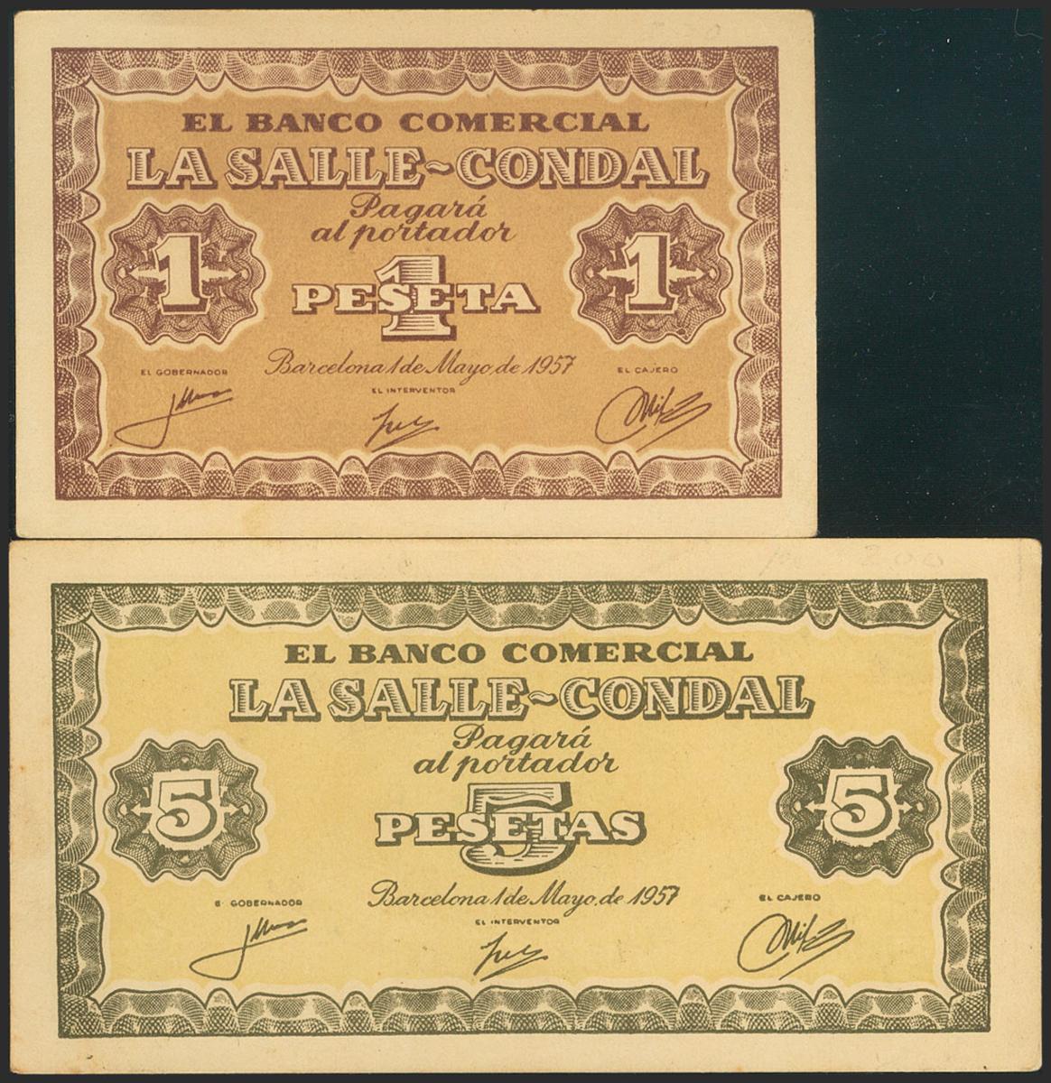 Set of 2 tokens from the Banco la Salle-Condal de Barcelona of 1 Peseta and 5 Pesetas, issued on May 1, 1957. Good Extremely Fine.
