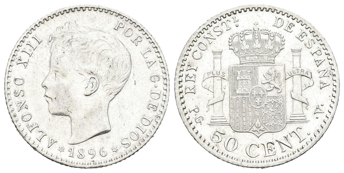 English ALFONSO XIII (1885-1931). 50 cents. (Ar. 2.50g / 18mm). 1896 * 9-6. Madrid PGV. (Cal-2019-44). Striped ear variant. Almost Extremely Fine. Cleaned. Limited.