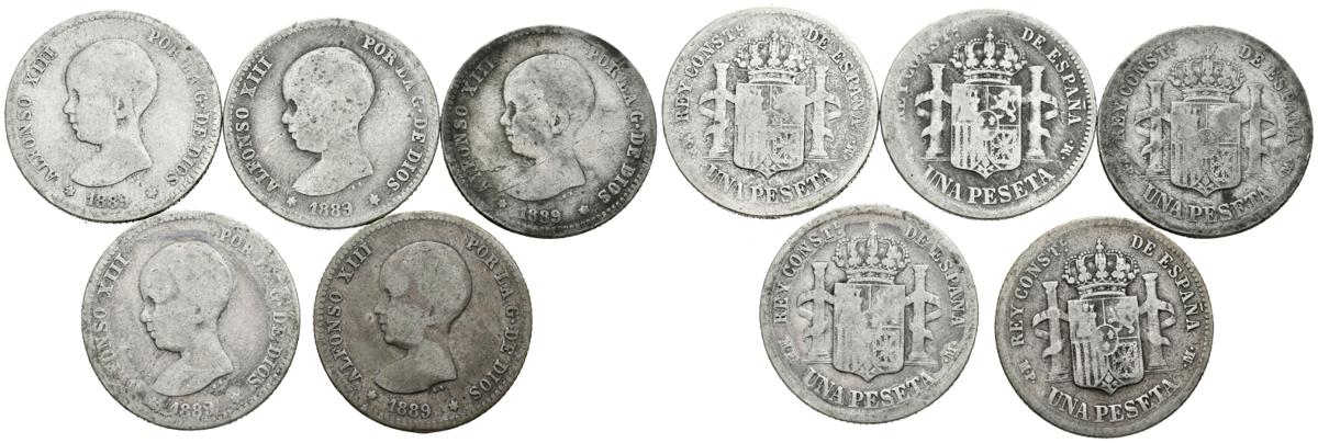 English ALFONSO XIII (1885-1931). Set consisting of 5 rare 1 peseta coins of 1889 * 18-99 MPM. Different states of conservation. TO EXAMINE.