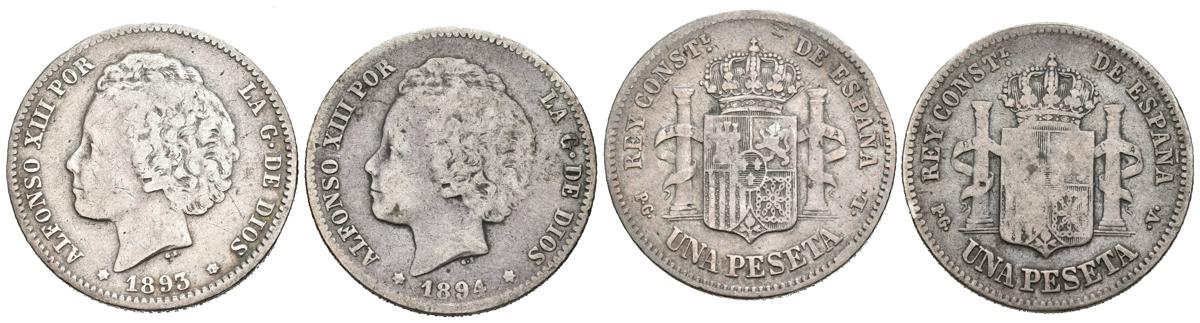 ALFONSO XIII (1885-1931). Set of 2 coins of 1 Peseta from 1893 (PGL) and 1894 (PGV). Different states of conservation. TO EXAMINE. Scarce