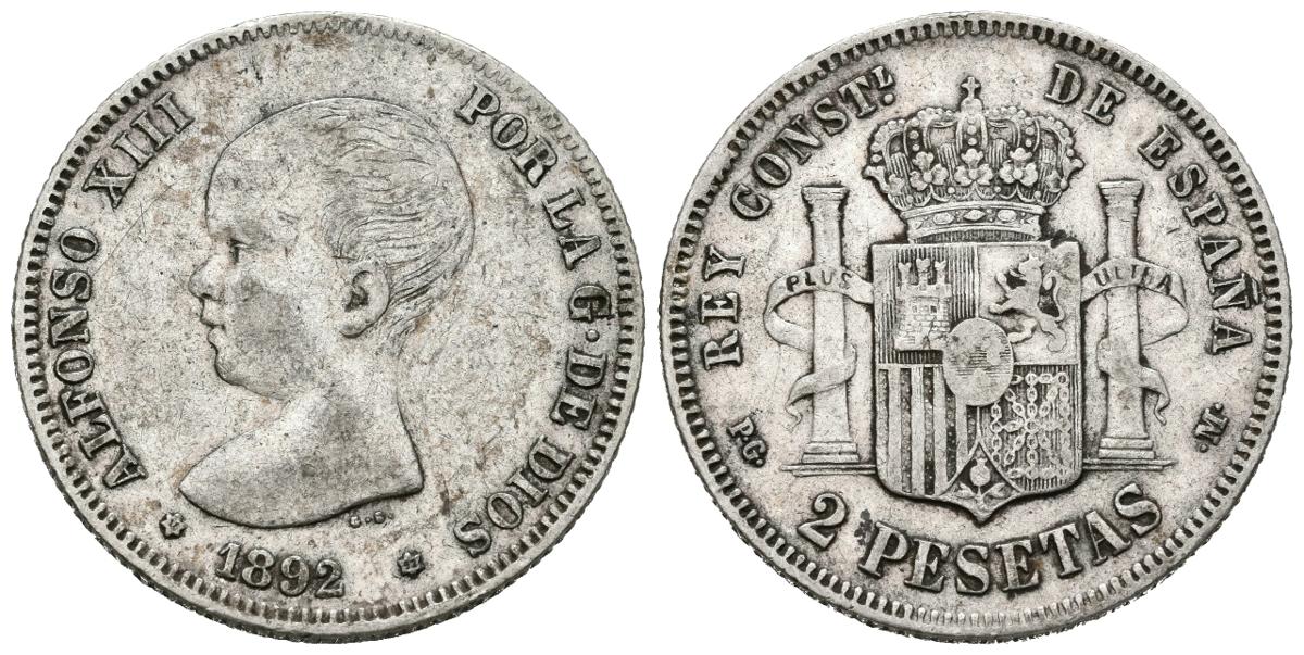 ALFONSO XIII (1885-1931). 2 Peseta (Ar. 9.94g / 27mm). 1892 * 18-92. Madrid PGM. (Cal-2019-85). Good Fine.