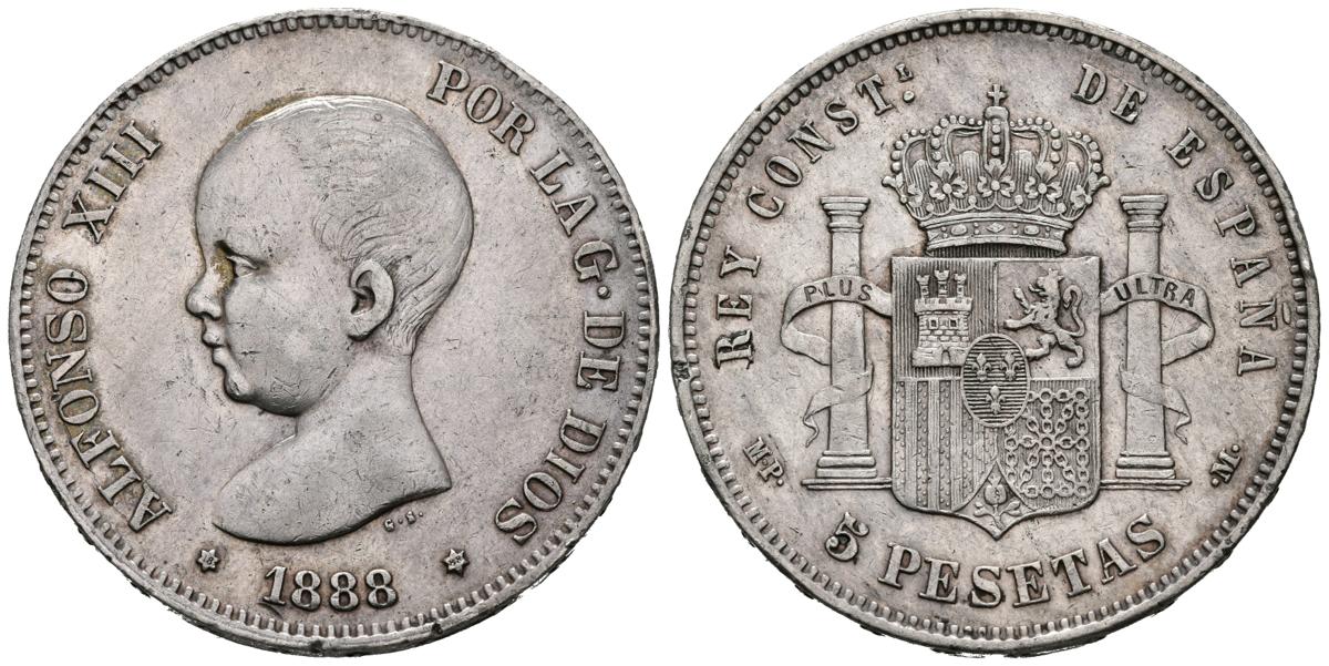 English ALFONSO XIII (1885-1931). 5 Pesetas. (Ar. 25.02g / 37mm). 1888 * 18-88. Madrid MPM. (Cal-2019-90). Very Fine.