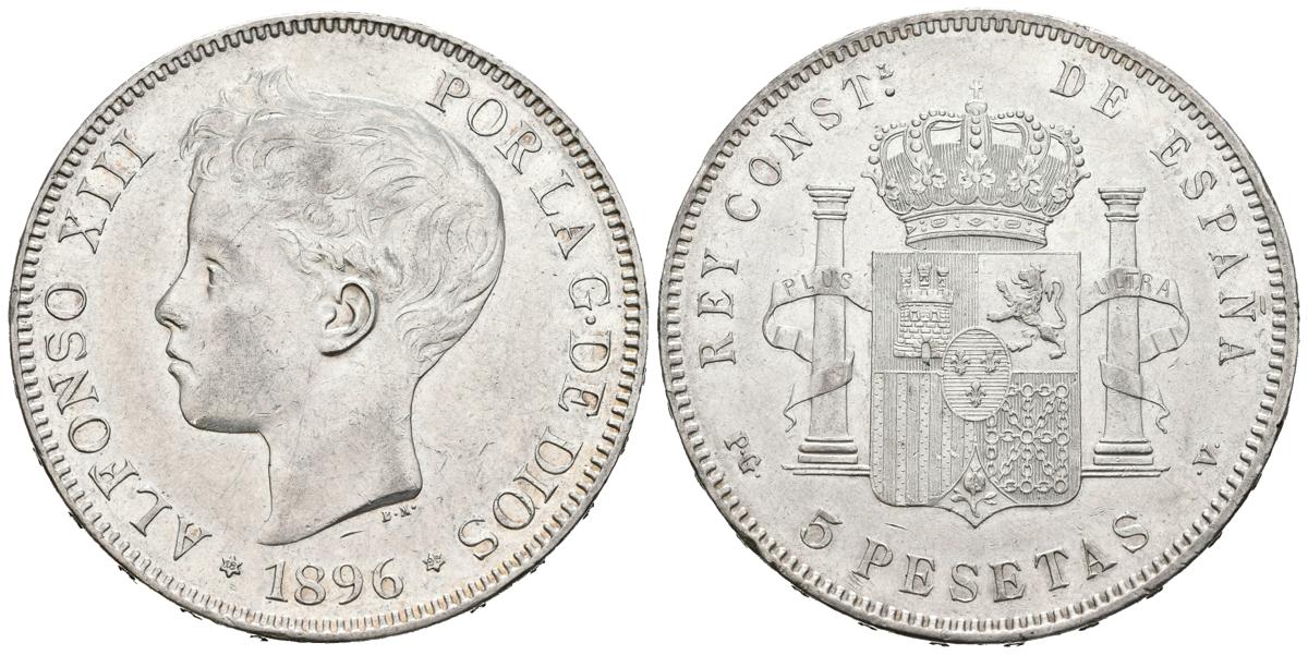 ALFONSO XIII (1885-1931). 5 Pesetas. (Ar. 24.91g / 37mm). 1896 * 18-96. Madrid PGV. (Cal-2019-106). Almost Extremely Fine. Little marquitas.