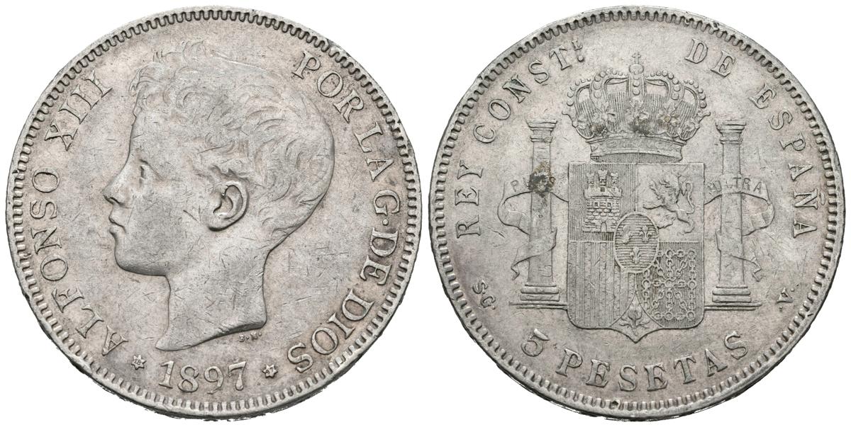 ALFONSO XIII (1885-1931). 5 Pesetas. (Ar. 24.93g / 37mm). 1897 * 18-97. Madrid PGV. (Cal-2019-107). Very Fine.