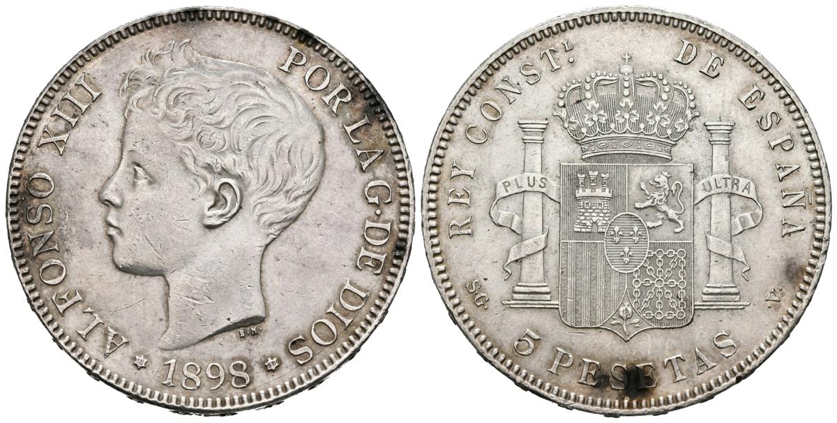 ALFONSO XIII (1885-1931). 5 Pesetas (Ar. 25.55g / 37mm). 1898 * 18-98. Madrid SGV. (Cal-2019-109). Almost Extremely Fine. Marquitas on the obverse. Black spots.