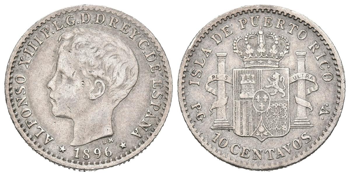 ALFONSO XIII (1885-1931). 10 cents. (Ar. 2.49g / 18mm). 1896. Puerto Rico PGV. (Cal-2019-125). Very Fine. Limited.