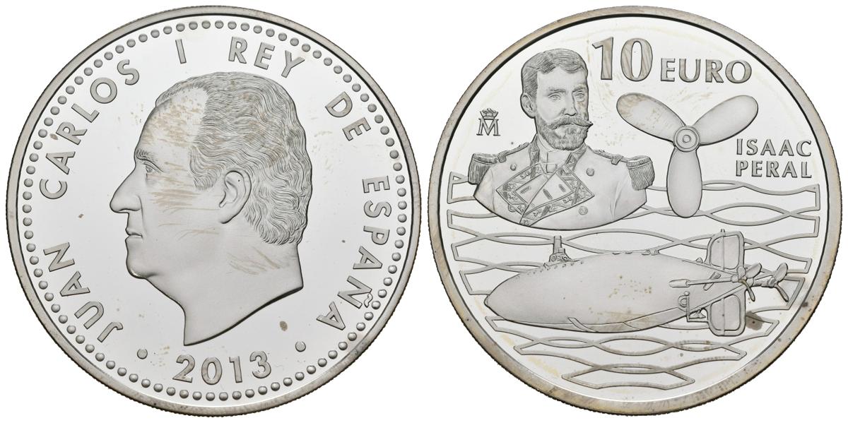 JUAN CARLOS I (1975-2014). 10 Euros (Ar. 27.00 / 40mm). 2013. FNMT. 125th Anniversary of Isaac Peral's submarine. PROOF. Presented in official box with certificate. Only 10 thousand units.