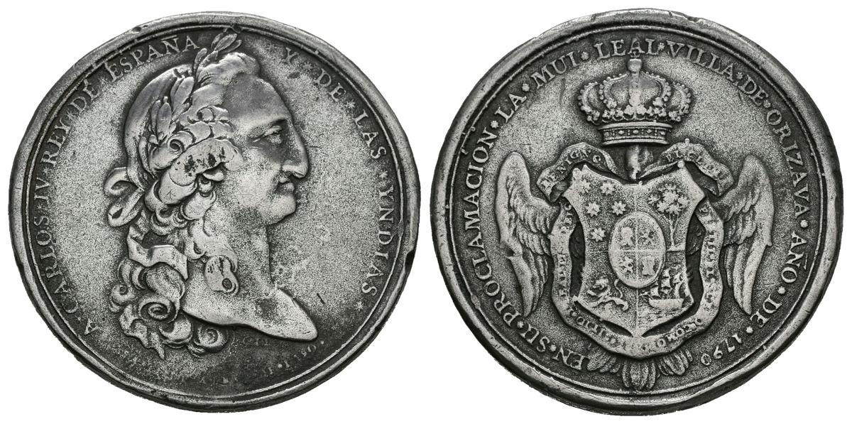 CARLOS IV (1788-1808). Proclamation in Orizaba, Mexico. (Ar. 24.34g / 40mm). 1790. (Vives 153 metal variation). Anv: Laureate bust of Carlos IV on the right, around legend: TO CARLOS IV, REY DE ESPAÑA Y DE LAS YNDIAS, below legend: APRIL II, 1790. Rev: Escudo crowned and quartered with five stars, tree, rampant lion on the left and a sailing ship, in the center oval escusón quartered with lions and castles, behind an extended eagle holding a ribbon that surrounds the shield with the inscription: BENIGNO THE FERTILE CLIMATE THE SOIL COMMODUS THE SITE AND LOYAL THE PEOPLE, around legend: IN ITS PROCLAMATION OF THE VERY LOYAL VILLA DE Very Fine YEAR OF 1790. VF. Some tap on the edge. Very rare. After declaring war against England in 1796 and for which an attack on the Port of Veracruz was feared, the viceroy of New Spain, the Marquis of Branciforte, decided that Orizaba would temporarily become the capital of the Viceroyalty. Orizaba, became the capital, then, between 1797 and 1798, another privilege that joins the one that Carlos III granted it a few years before in January 1774 when giving it the category of town.