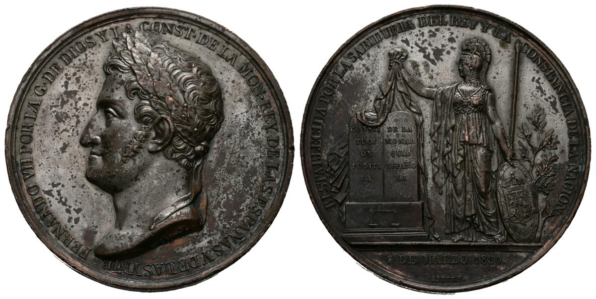 FERNANDO VII (1808-1833). Restoration of the Constitution of 1812. (Silvered bronze. 71.88 / 50mm). March 7, 1820. Caque and Barre Engravers. (Vives 337 metal variants). Anv: Laureate head of Ferdinand VII on the left, around the legend: FERNANDO VII FOR THE G OF GOD AND THE CONSTITUTION OF THE MON KING OF SPAIN AND YND. Rev: Minerva standing to the left carrying spear and shield, uncovering tablets with inscription: CONSTITUCION POLITICA / DE LA MONARQUIA ESPAÑOLA, around the legend: RESTABLISHED BY THE WISDOM OF THE KING AND THE CONSTANCE OF THE NATION, below: MARCH 7, 1820. Good Very Fine. The popular Constitution of 1812 was proclaimed up to three times. In addition to the one of 12, it was also in 1820 and in a short period in 1836. In this one that concerns us marks the starting gun of the well-known Liberal Triennium and was sworn in by the king, pressured by the social situation of the country, the March 9, 1820. The Constitution established, among other important developments, that sovereignty rested with the nation, not with the king, the separation of powers or indirect universal male suffrage. Only three years later it ceased to have effect, beginning the so-called Ominous Decade.