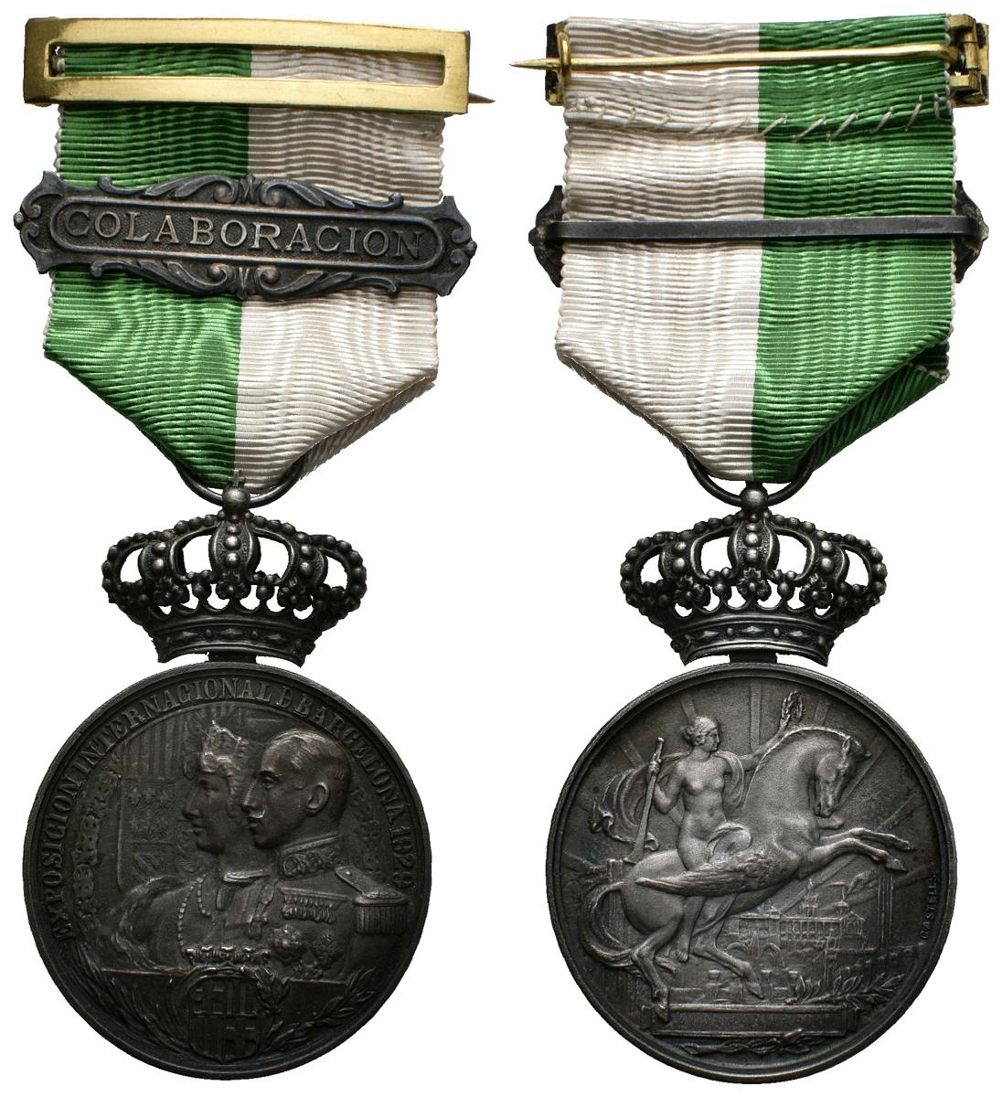 ALFONSO XIII (1885-1931). Barcelona International Exhibition. Collaboration. (Ae-silver. 41.64g / 35mm). 1929. Engraver: Castells. (Cru. Medalles 1262a). Includes crown, ring and ribbon as well as the original Hijos de B. Castells case. Good Extremely Fine. Limited. The 1929 Exhibition was the final knock for the modernization, especially urban planning, of Barcelona. On May 19 of that year, the King, Alfonso XIII and Queen Victoria Eugenia, after the speech of General Primo de Rivera who was still at the head of the governing military directory, declared the International Exhibition to be inaugurated. The Montjuic mountain was the main protagonist on this occasion, in the same way that the Parc de la Ciutadella was in the previous one in 1888.