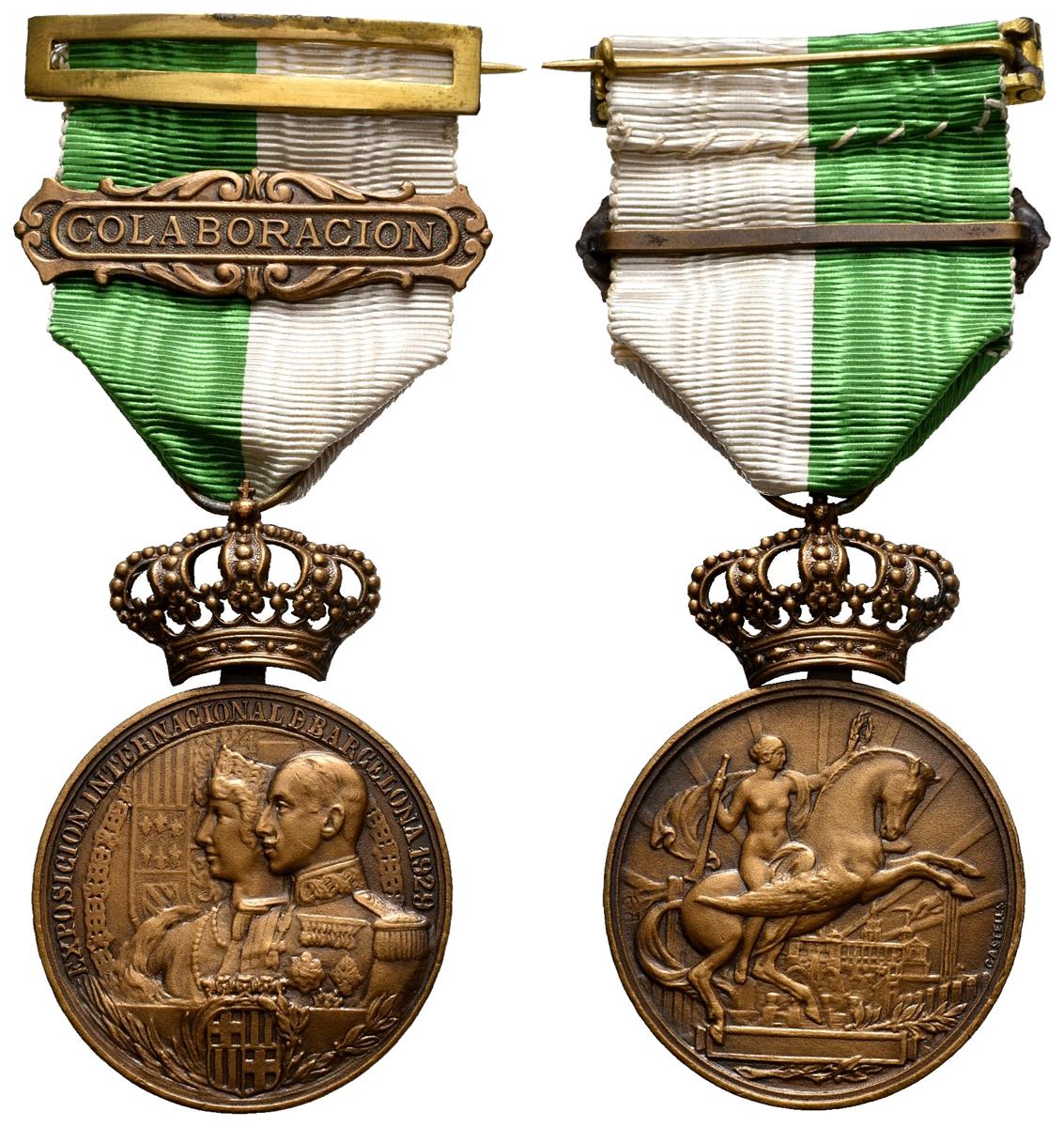 ALFONSO XIII (1885-1931). Barcelona International Exhibition. Cooperation. (Ae. 27.03g / 35mm). 1929. Engraver: Castells. (Cru. Medalles 1262a). Crown and ribbon separate from the medal. Includes original case of Hijos de B. Castells. Extremely Fine. Limited.