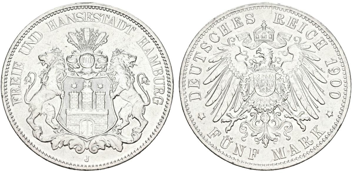 GERMANY. 5 Mark (Ar. 27.62g / 38mm). 1900. Hamburg J. German Empire. (Km # 293). Very Fine. Cleaned.