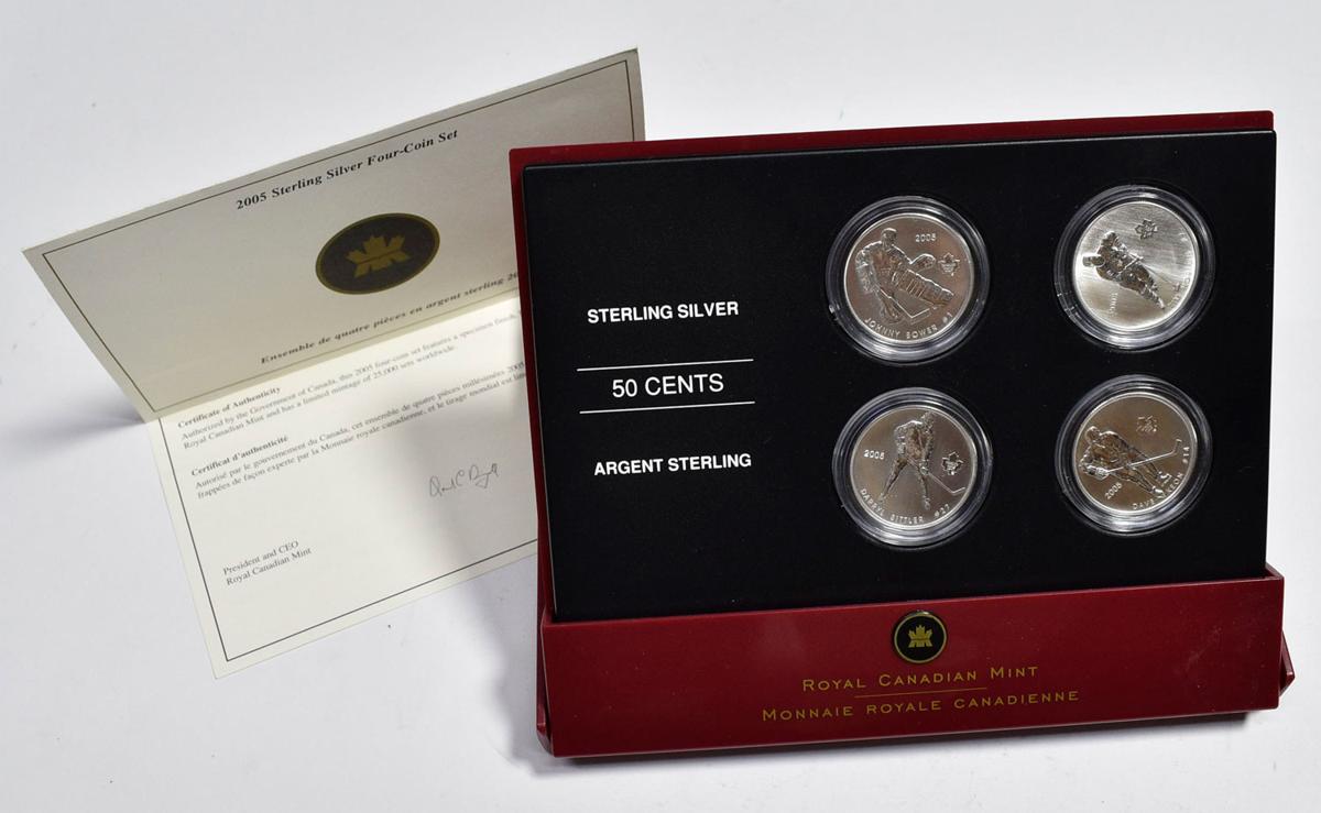 English CANADA. Complete set consisting of 4 silver 50 Cent coins with the theme of Hockey Legends. Royal Canadian Mint. 2005. Weight and measure per coin: 9.3g / 27mm. Includes original box and certificate of authenticity. Edition of 25,000 copies.