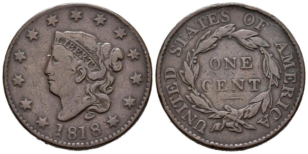 English USA. 1 Large Cents (Ae. 10.54g / 28mm). 1818. Philadelphia. (Km # 45). Almost Very Fine.