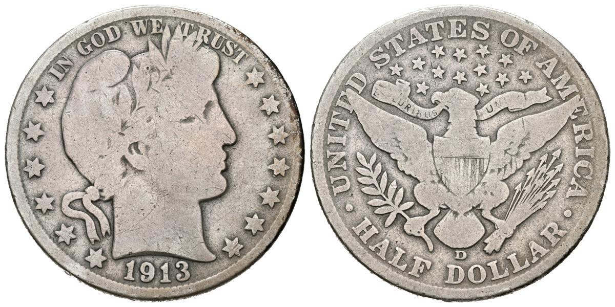 English USA. 1/2 Dollar (Ar. 11.88g / 30mm). 1913. Denver. D. Barber type. (Km # 116). Fine. Limited.