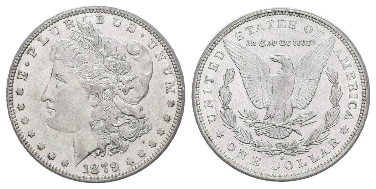 USA. 1 USD (Ar. 26.73g / 38mm) *. 1879. New Orleans O. (Km # 110). AU 53. Encapsulated by PCGS. * Theoretical weight and measure.