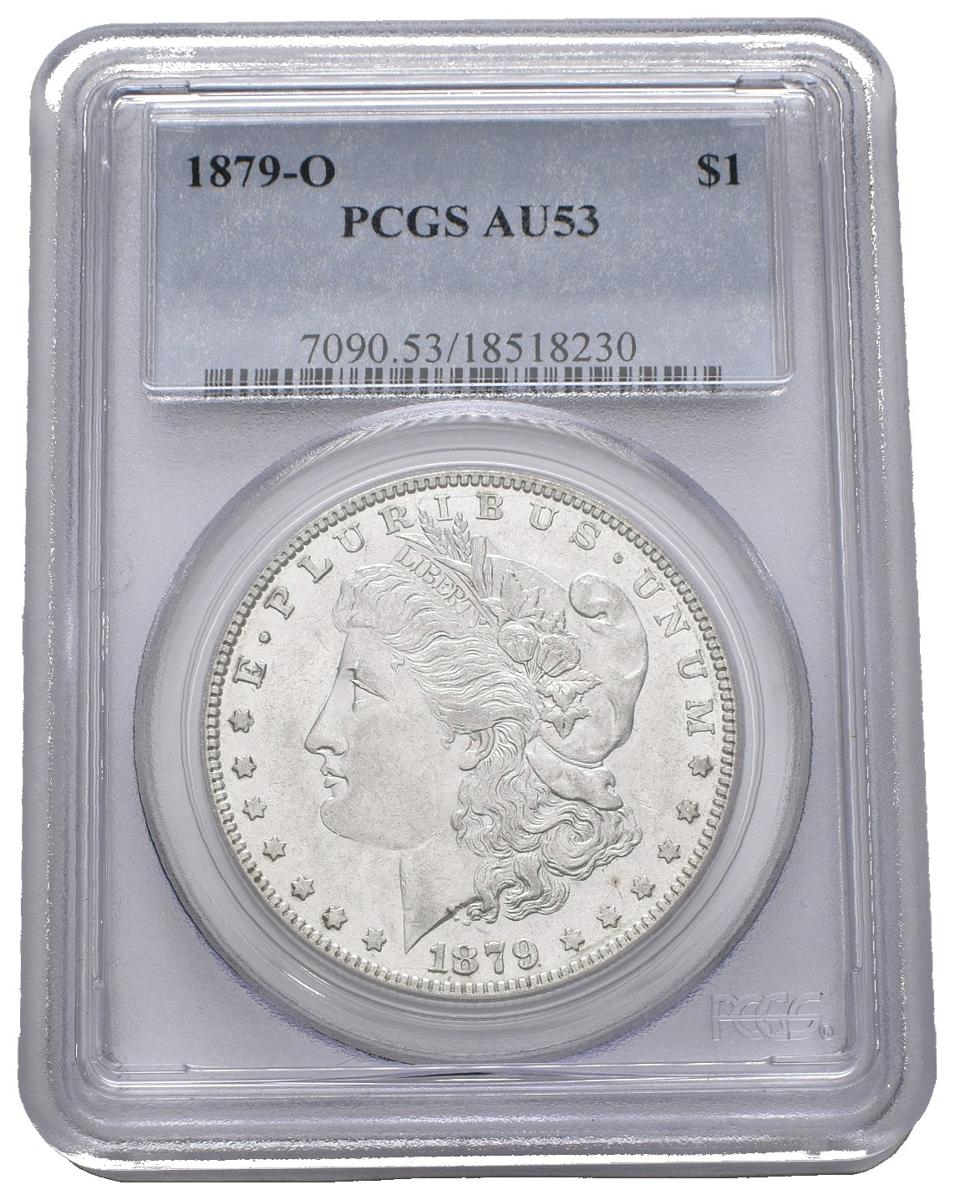 USA. 1 USD (Ar. 26.73g / 38mm) *. 1879. New Orleans O. (Km # 110). AU 53. Encapsulated by PCGS. * Theoretical weight and measure.