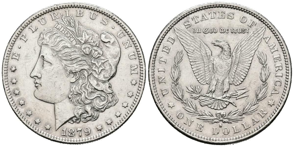 USA. 1 USD (Ar. 26.75g / 38mm) *. 1879. San Francisco S. (Km # 110). Good Very Fine. Cleaned. Marquitas.