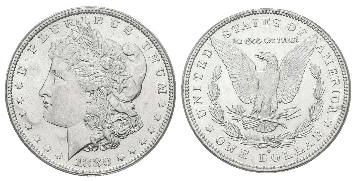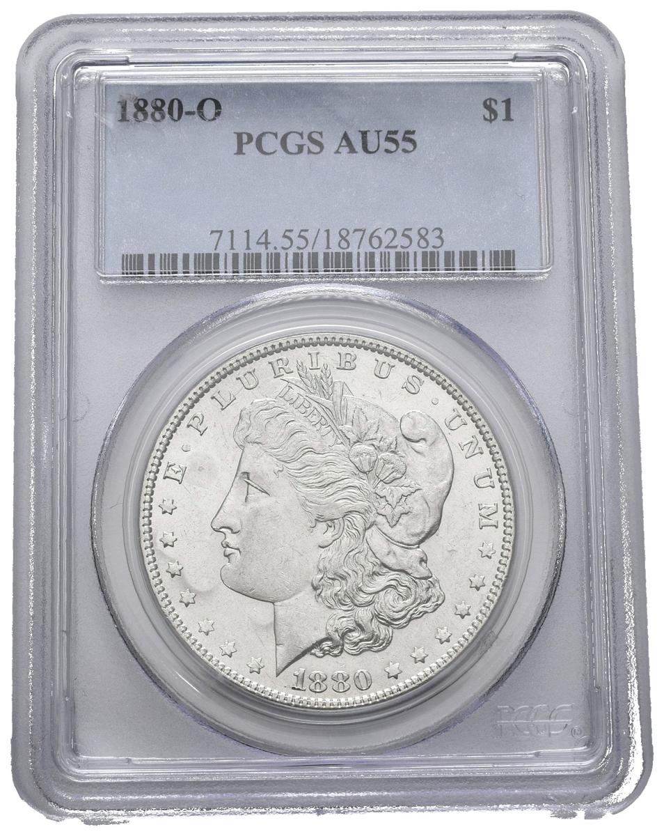 English USA. 1 USD (Ar. 26.73g / 38mm) *. 1880. New Orleans O. (Km # 110). AU 55. Encapsulated by PCGS. * Theoretical weight and measure.