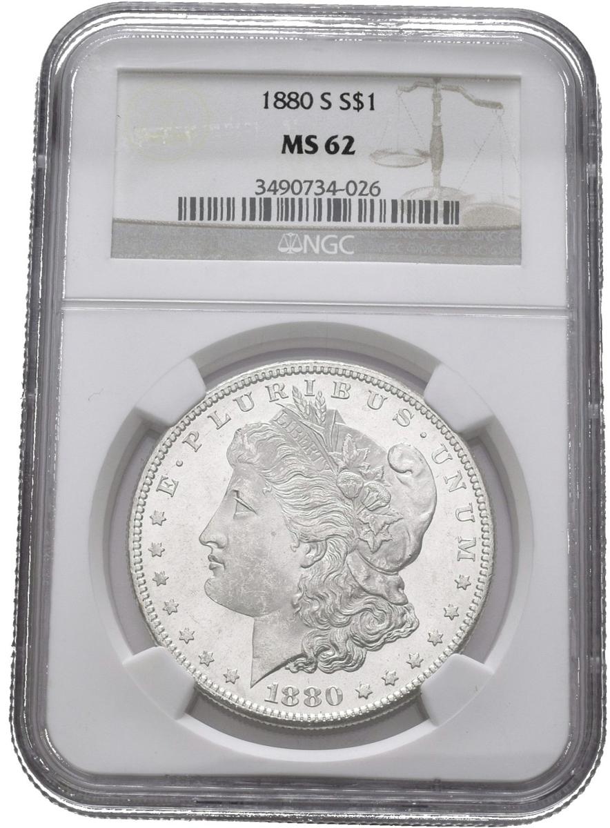 USA. 1 USD (Ar. 26.73g / 38mm) *. 1880. San Francisco S. (Km # 110). MS 62. Encapsulated by NGC. * Theoretical weight and measure.