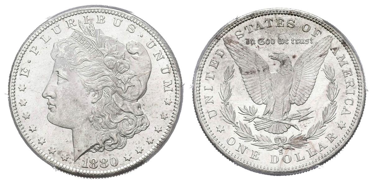 USA. 1 USD (Ar. 26.73g / 38mm) *. 1880. San Francisco S. (Km # 110). MS 62. Encapsulated by PCGS. * Theoretical weight and measure.