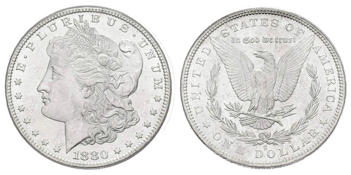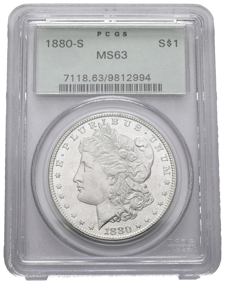 English USA. 1 USD (Ar. 26.73g / 38mm) *. 1880. San Francisco S. (Km # 110). MS 63. Encapsulated by PCGS. * Theoretical weight and measure.