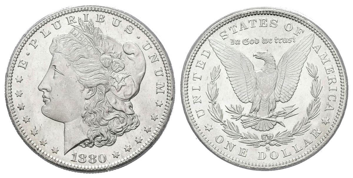 USA. 1 USD (Ar. 26.73g / 38mm) *. 1880. San Francisco S. (Km # 110). MS 63+. Encapsulated by PCGS. * Theoretical weight and measure.