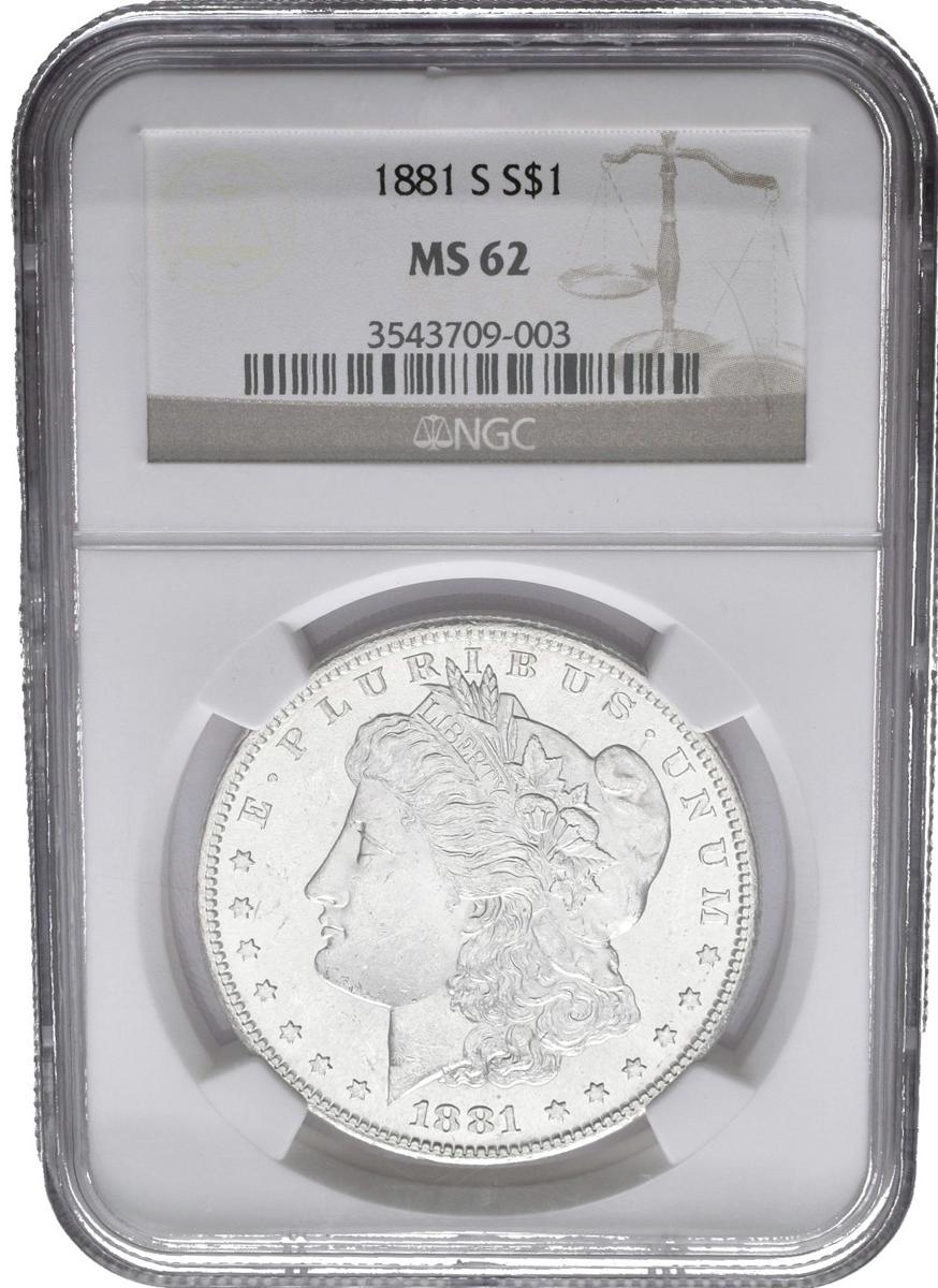 USA. 1 USD (Ar. 26.73g / 38mm) *. 1881. San Francisco S. (Km # 110). MS 62. Encapsulated by NGC. * Theoretical weight and measure.
