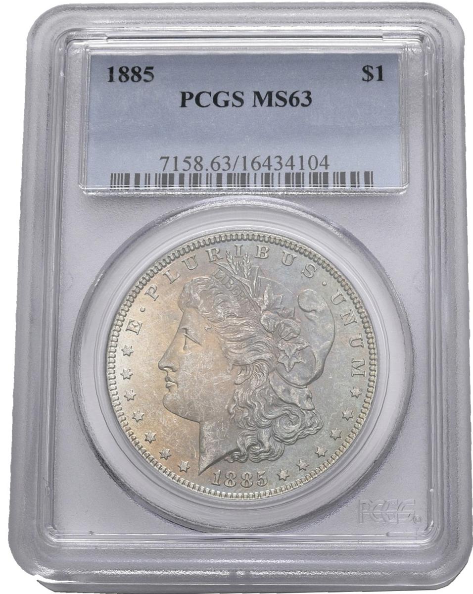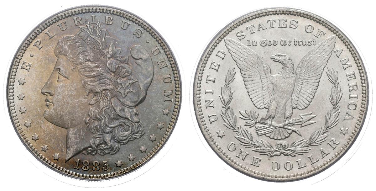 USA. 1 USD (Ar. 26.73g / 38mm) *. 1885. Philadelphia. (Km # 110). MS 63. Encapsulated by PCGS. * Theoretical weight and measure.