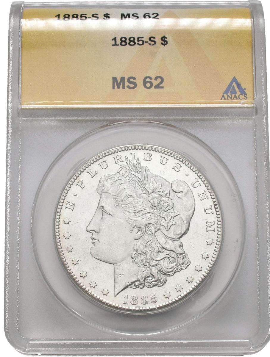 English USA. 1 USD (Ar. 26.73g / 38mm) *. 1885. San Francisco S (Km # 110). MS 62. Encapsulated by ANACS. * Theoretical weight and measure.