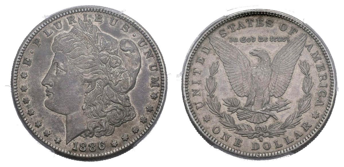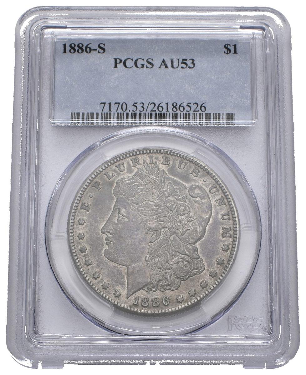 USA. 1 USD (Ar. 26.73g / 38mm) *. 1886. San Francisco S. (Km # 110). UA 53. Scarce. 750 thousand minted units. Encapsulated by PCGS. * Theoretical weight and measure.