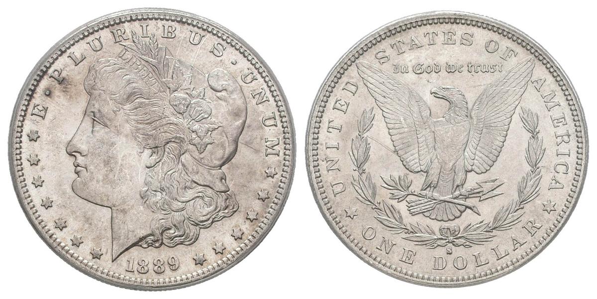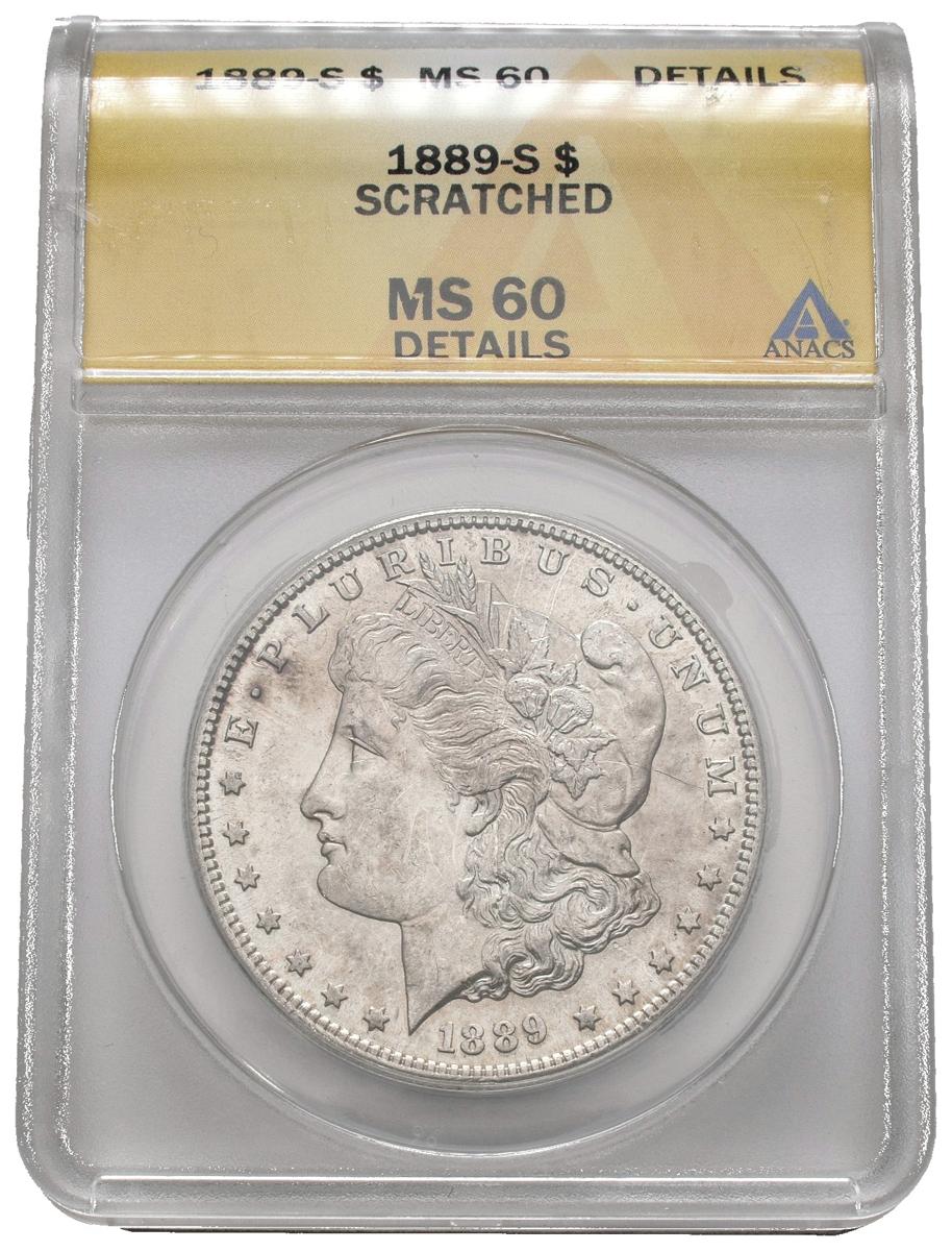 USA. 1 USD (Ar. 26.73g / 38mm) *. 1889. San Francisco S. (Km # 110). MS 60 Details. Stripes. Limited. Minting of 700 thousand units. Encapsulated by ANACS. * Theoretical weight and measure.