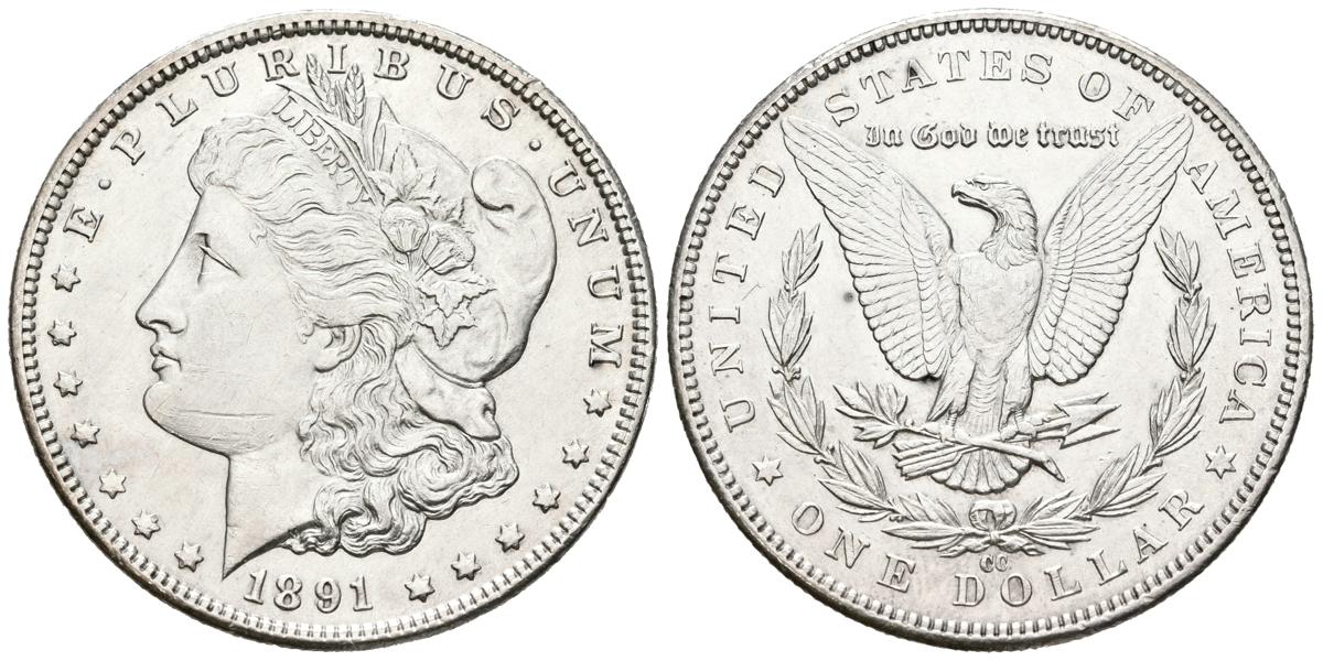 English USA. 1 USD (Ar. 26.71g / 38mm). 1891. Carson City. DC. (Km # 110). Extremely Fine. Marquitas on the obverse.
