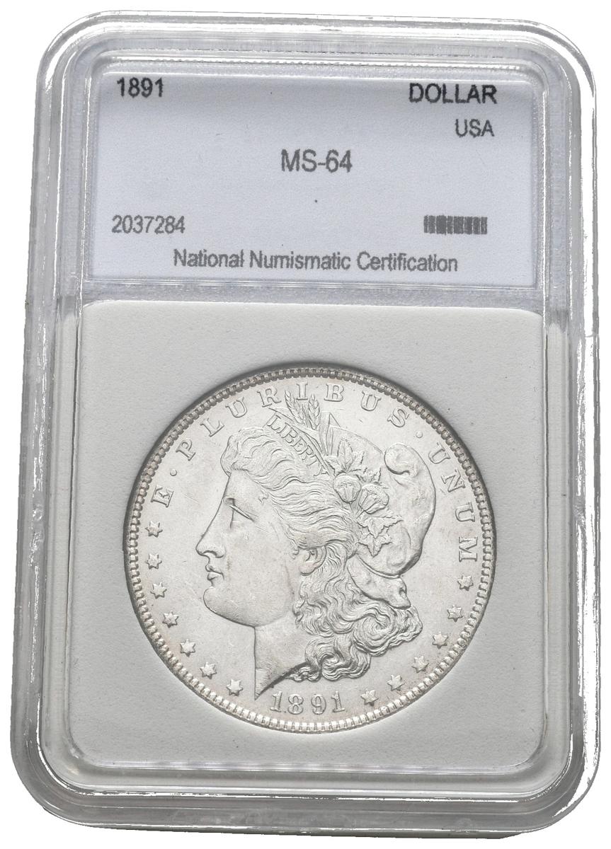 USA. 1 USD (Ar. 26.73g / 38mm) *. 1891. Philadelphia. (Km # 110). MS 64. Encapsulated by NNC. * Theoretical weight and measure.