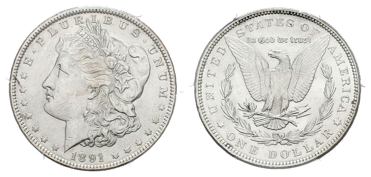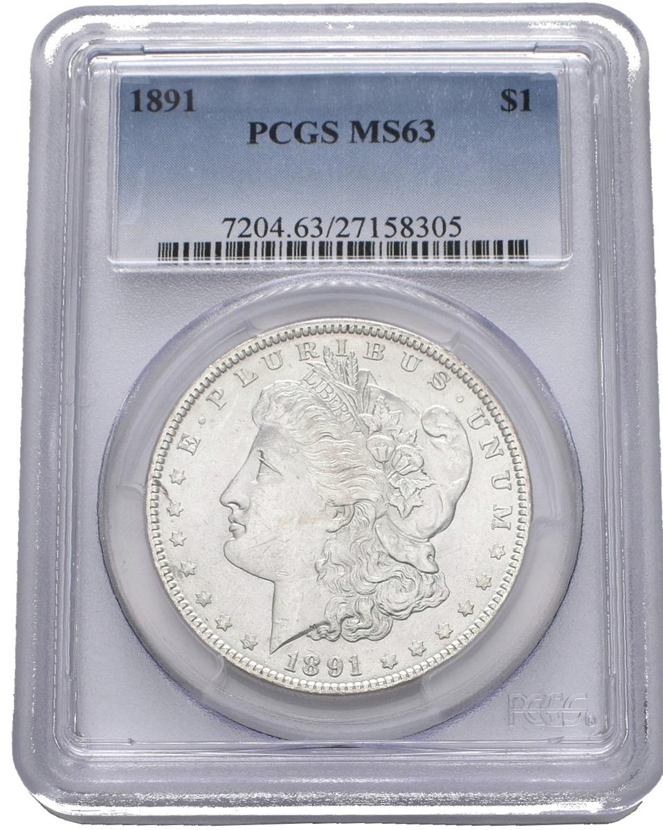 USA. 1 USD (Ar. 26.73g / 38mm) *. 1891. Philadelphia. (Km # 110). MS 63. Encapsulated by PCGS. * Theoretical weight and measure.