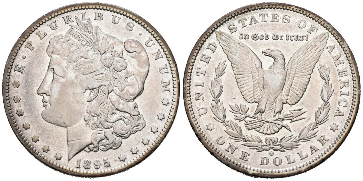 English USA. 1 USD (Ar. 26.41g / 38mm). 1895. New Orleans. O. (Km # 110). Very Fine. Limited. Only 450 thousand copies.