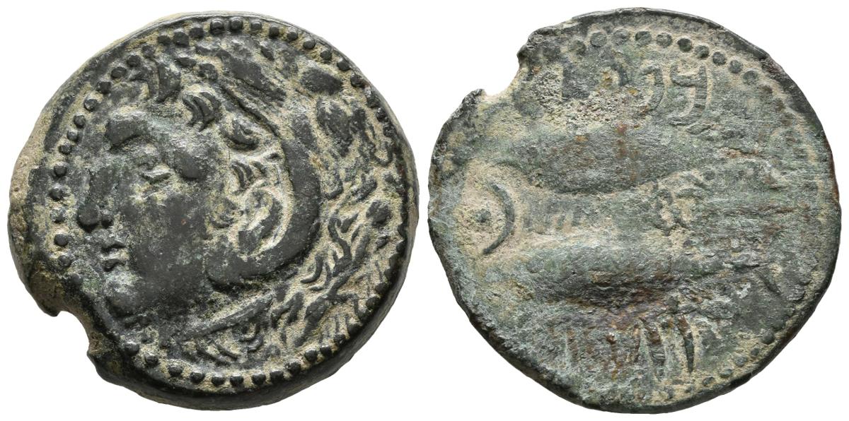 English GADES (Cádiz). As. (Ae. 13.51g / 27mm). 100-20 BC (FAB-1343). Anv: Head of Hercules with lion skin on left with club. Rev: Two tunas on the left, among them crescent and point and caduceus, above and below Punic legend. Very Fine/ Almost Very Fine.