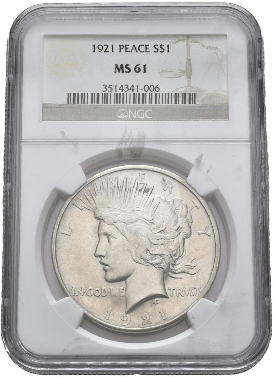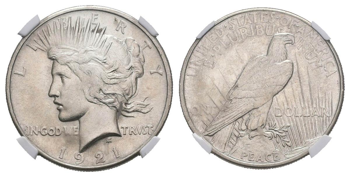 USA. 1 USD (Ar. 26.73g / 38mm) *. 1921. Philadelphia. Peace guy. (Km # 150). MS 61. Encapsulated by NGC. * Theoretical weight and measurement.