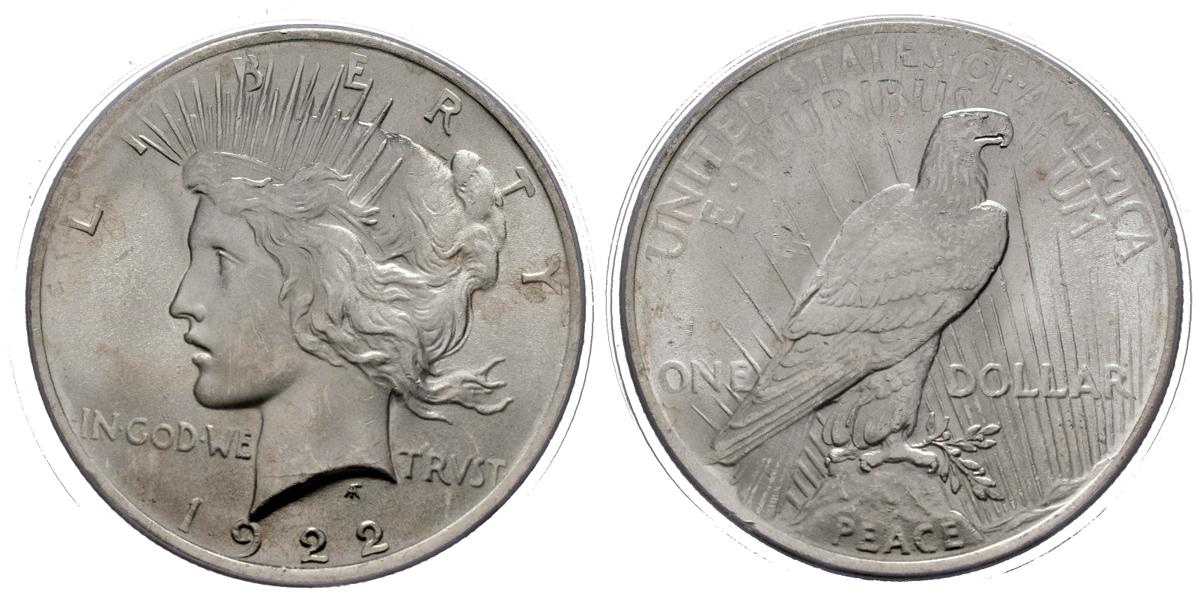 USA. 1 USD (Ar. 26.73g / 38mm) *. 1922. Philadelphia. Peace guy. (Km # 150). MS 63. Encapsulated by PGCS. * Theoretical weight and measurement.