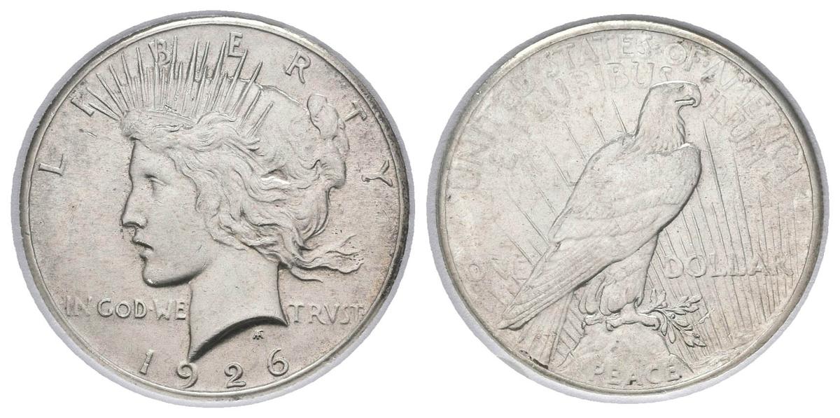 English USA. 1 USD (Ar. 26.73g / 38mm) *. 1926. Philadelphia. Peace guy. (Km # 150). MS 67. Encapsulated by ANGS. * Theoretical weight and measurement.