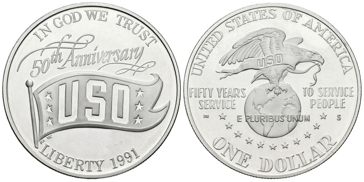 USA. 1 USD (Ar. 26.52g / 38mm). 1991. San Francisco. S. 50th anniversary of USO. (Km # 232). PROOF.