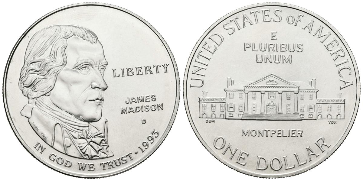USA. 1 USD (Ar. 26,40g / 38mm). 1993. Denver. D. James Madison. (Km # 241). Uncirculated.