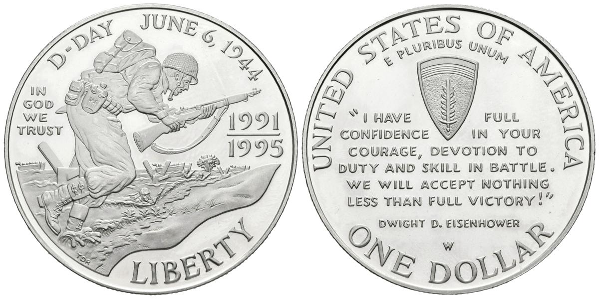 English USA. 1 USD (Ar. 26.79g / 38mm). 1993. West Point. W. 50th Anniversary Day D. (World War II). (Km # 244). PROOF.