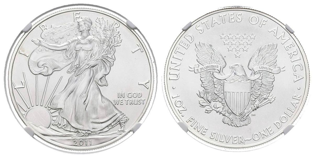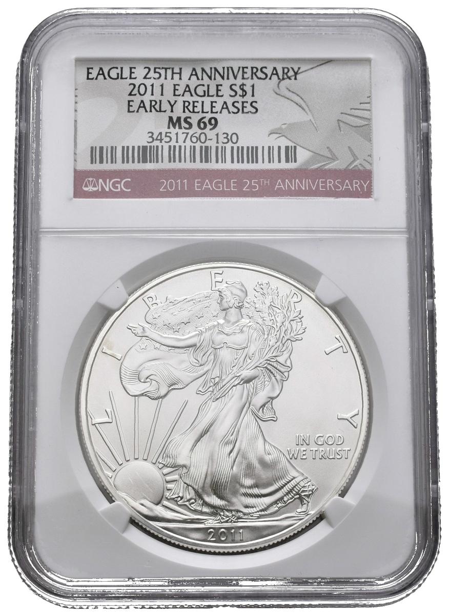 USA. 1 USD (Ar.31.00g / 41mm) *. 2011. No mint mark. Eagle 25th Aniversary. Early Releases. (Km # 273). MS 69. Encapsulated by NGC. * Theoretical weight and measure.